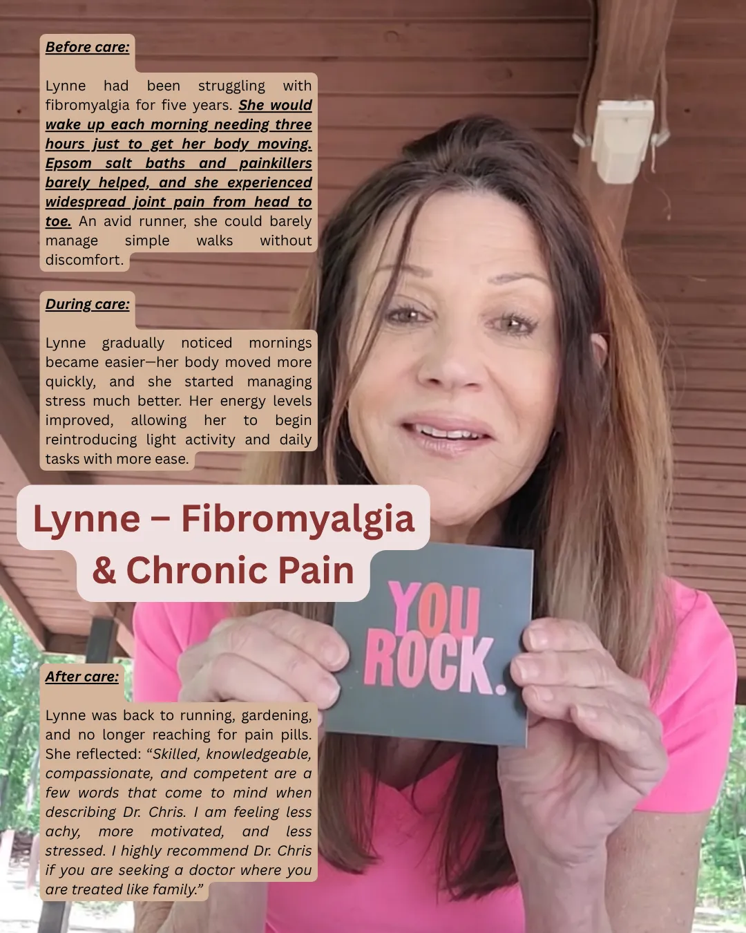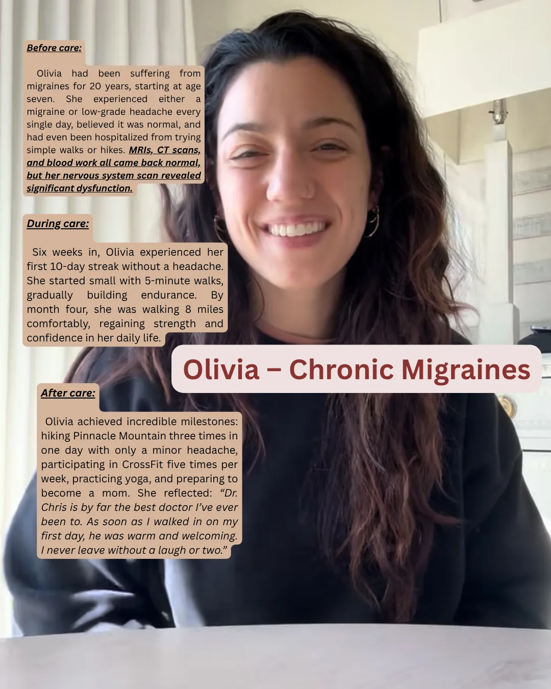 Since then, I’ve seen decades of daily migraines vanish, crippling fibromyalgia transform into CrossFit and Pilates, lupus markers normalize, unexplained anxiety, vertigo, and chest pain clear, and athletes gain measurable performance in weeks. I’ve helped patients overcome paralysis, toxic mold exposure, dysautonomia, POTS, brain fog, muscle atrophy, sleep apnea, depression, and anxiety.